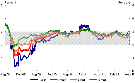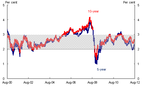 Of the available measures of inflation expectations, those available with highest frequency are taken from financial market pricing — so-called ‘break-even’ inflation rates from the bond market and the market for inflation swaps. Bond market derived measures — which can be subject to both positive and negative biases — suggest medium-term inflation expectations are currently anchored within the Reserve Bank of Australia’s target band. Inflation swap rates — which can be subject to their own biases — also suggest that medium-term expectations are well contained. Finally, forward inflation expectations derived from the inflation swaps curve suggest that the market concurs with Treasury estimates that the introduction of the carbon price will have a modest, one-off impact on headline CPI of around 0.7 per cent in 2012-13.