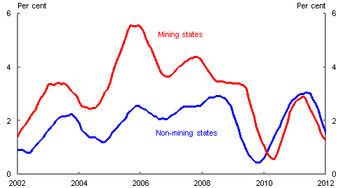 The stronger growth in the mining states has also led to a more rapid decline in the unemployment rate in those states. As highlighted by Garton (2008), this has reversed previous experiences — where mining states had higher unemployment rates. The unemployment rate in the mining states was 1 percentage point lower than in the non-mining states’ prior to the onset of the global financial crisis (Chart 2).
