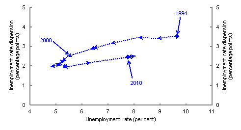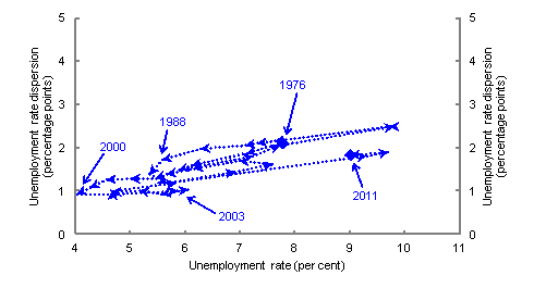 An increase in demand for labour in a region will see unemployment in that region fall, which will encourage higher workforce participation. If this demand cannot be met, employers will adjust wages to attract new workers including those from other regions. This effectively reduces available labour and leads to a fall in unemployment in these other regions. Hence, we would expect a lower degree of dispersion; albeit with a lag (see, for example, Debelle and Vickery 1998). As such, we would expect a positive relationship between aggregate unemployment and unemployment dispersion.