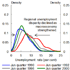 Overall, the distribution has narrowed and shifted to the left since the early 2000s. However, as the effects of the global financial crisis hit the labour market, the distribution widened and became less even. The subsequent general economic recovery and re-emergence of the resources boom have resulted in a further narrowing of the density more recently.