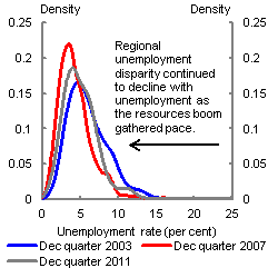 As of the December quarter 2011, the national unemployment rate was 5.1 per cent and around 57 per cent of the (SLA) areas had an unemployment rate of 5 per cent or less. While current labour market conditions are not as strong as those that prevailed just before the global financial crisis, they are considerably stronger than those before the resources boom, with lower average unemployment and a more even distribution. For instance, as of the December quarter 2002, there were only around 24 per cent of the areas with unemployment rates within 1 percentage point of the national average. This is considerably lower than the proportion as of the December quarter 2011 of just below 30 per cent and around 32 per cent prior to the global financial crisis. Hence, the distribution of unemployment distribution across regions has become more even.