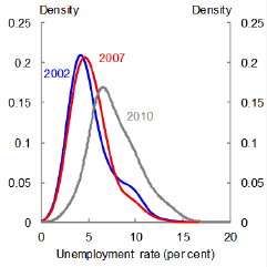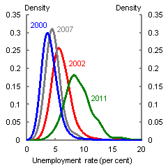 Since the crisis, the distribution of unemployment has been more uneven for both the UK and the US (Chart 6). In particular, around half of the US counties had an unemployment rate within 1 percentage point of the national average in 2007. This compares to only around a quarter of the counties in 2011. Similarly for the UK, around 40 per cent of the counties had an unemployment rate within the 1 percentage point range in 2007. This proportion has fallen markedly since the global financial crisis to only around 25 per cent in 2010.