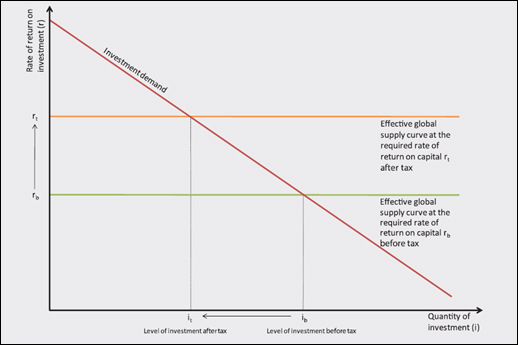 Capital flows from foreign investment into the domestic economy will continue until the demand and supply of investment equal at the required before-tax rate of return. This point is shown as ib on the chart for the case where there is no company income tax (that is before taxes are levied).