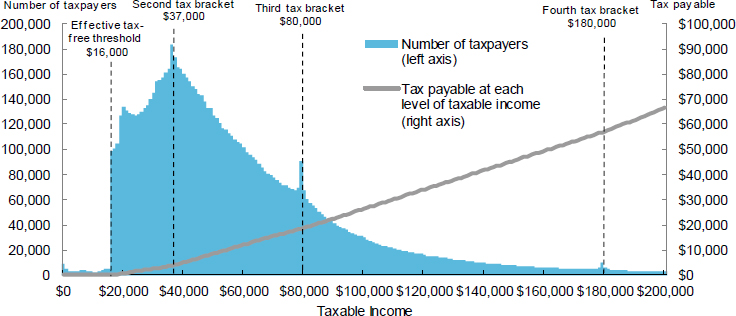 This chart has a lot of information. It shows, perhaps unsurprisingly, the vast bulk of taxpayers clustered around low to middle incomes. An interesting feature is the ‘bunching’ of taxpayers just before each of the thresholds.