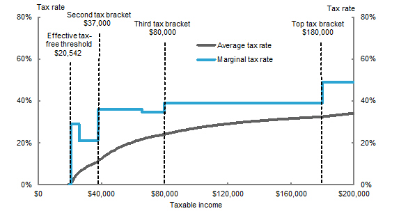 For example, a single person in New Zealand earning NZD$40,000 a year would have a marginal rate of 19 per cent and pay NZD$6,600 in tax. In Australia, someone earning AUD$40,000 would have a marginal rate of 36 per cent but only pay AUD$4,947.