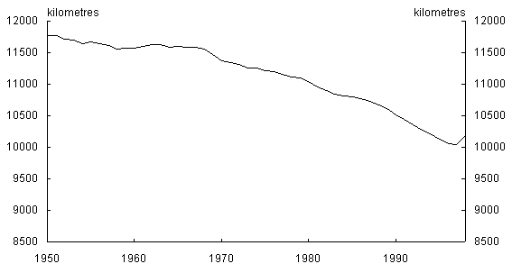Table 1 also shows the remoteness of the same group of countries for 1950, and the percentage change over those 48 years. All of the European countries have become more remote, by around 20percent, while Asian countries in the group have generally become less remote. South Korea is particularly notable, with a 29percent fall in remoteness.