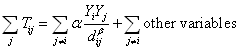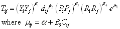 where Tijis the trade between countries i and j, Yi is the economic mass (normally measured as GDP) of country i, dijis the distance between countries i and j, and