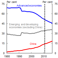 China's remarkable growth over the past 30 years has meant that its economy has doubled in size every seven to eight years. It now accounts for almost 15 per cent of global GDP on a purchasing power parity (PPP) basis and has accounted for almost 70 per cent of the increase in the weight of emerging market economies in global GDP since 1990 (Chart 1). Investment has been a key driver of China's growth, particularly over the past decade, and now accounts for nearly 50 per cent of GDP.