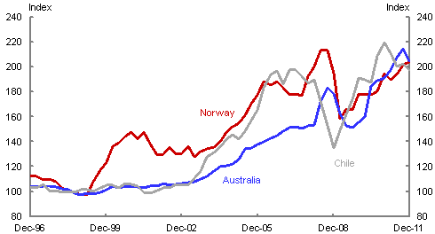 Another key factor has been the difference in investment responses to high commodity prices (Chart 8). While real investment in Chile and Australia has grown substantially faster than real incomes, real investment in Norway has not even matched growth in real GDP. Norway has experienced a much lesser increase in resource sector investment, which may be linked to the fact that the remaining life of its oil and gas reserves is limited (Garton and Gruen 2012). This has made it much easier for the fiscal regime in Norway to limit the impact of the boom on aggregate spending and, thereby, on the real exchange rate.