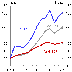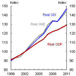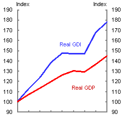 Note: GDI is deflated by the implicit price deflator for gross national expenditure.
