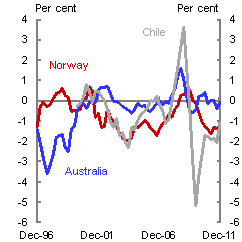 The combined impact of Norway’s fiscal regime and the absence of a resource sector investment boom is likely to explain much of Norway’s more limited real appreciation compared to Australia and Chile. Another factor likely to have influenced exchange rate behaviour is differences in cyclical conditions in the three economies, manifested in differences in the degree of spare capacity.