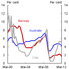 The difference in cyclical conditions between Australia and the other two economies is also seen in differences in the stance of monetary policy. Norway and Chile began the 2000s with higher policy interest rates than Australia, but after considerable easing in the early 2000s have since been generally lower than Australian rates (Chart 10).