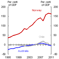 However, the economic structures of Australia and Norway are considerably different — Australia, for one, captures a much smaller share of the increased national income associated with resource booms (Garton and Gruen 2012). Furthermore, it is likely that the requirement would be even greater than this because of the larger surge in investment to expand resource sector capacity that has been occurring in Australia. This suggests, taking into account the favourable saving and macroeconomic stability outcomes already achieved during the current boom, that it would be inherently difficult, and not necessarily sensible to replicate the Norwegian experience, particularly within the current global economic environment.