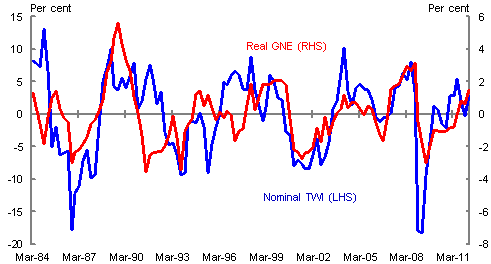 This can be seen in Chart 5, which shows the cumulative gap between growth in real gross national income and expenditure and cumulative growth in real GDP since the end of 2002. These gaps provide measures of the income gain from the terms of trade and the extent to which it has fed into increased spending (with a constant terms of trade, real national income would have grown in line with real GDP).