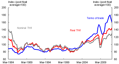 - higher aggregate incomes resulting from the rise in the terms of trade lead to an increase in consumption spending, much of which is on domestic goods.