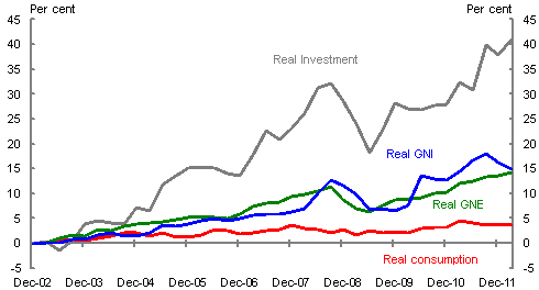 Real national income has grown by 15 percentage points more than real GDP over this period, while real national expenditure has grown 14 percentage points more. This is due largely to very strong growth in investment, though consumption has also grown about 4 percentage points faster than real GDP.