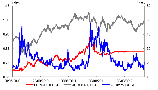 Chart 5: Swiss francs per euro, AUD/USD and the VIX index