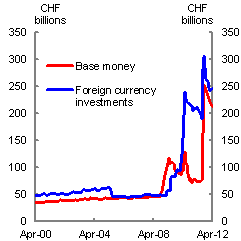 Despite these deflationary pressures, safe haven flows have continued to put upward pressure on the franc. To counter this, the SNB intervened and set a minimum exchange rate of 1.20 Swiss francs per euro on 6 September 2011.12