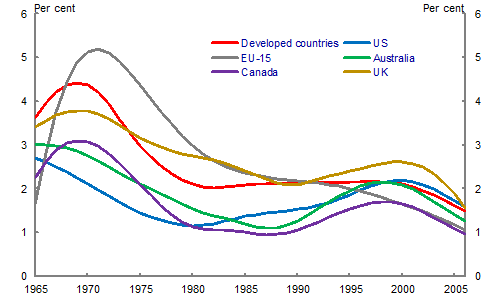 The peak in labour productivity growth in developed countries during the 1950s and 1960s has been associated with rebuilding from the World Wars and the Great Depression (Maddison 2001). In the US, rapid growth during this time was supported by an abundance of new technology that was not fully exploited during the Great Depression and World War II. Other countries took advantage of the new opening of trade and mobility of technology following the war to catch up to the US productivity level. Some slowing in the 1970s has been considered to be inevitable in developed economies after this period (Maddison 2001).