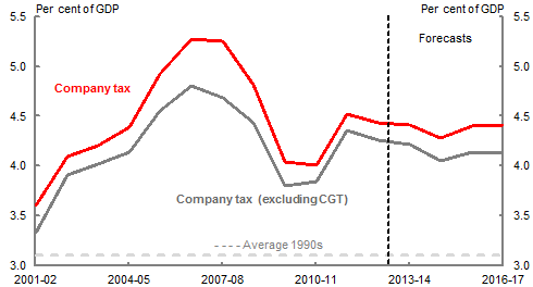Despite this resurgence in growth, company tax (excluding CGT) receipts in 2012-13 as a share of GDP remained around 0.4 percentage points (9 per cent) below 2007-08 levels. Weaker commodity prices and the persistently high Australian dollar, which has put pressure on domestic prices, have hit company profits across most of the economy, including the resources sector.6 Company tax (excluding CGT) is forecast to be around 4.1 per cent of GDP in 2016-17. These forecasts are significantly higher (around 30 per cent) than the 1990s average of around 3.1 per cent of GDP. Investment in the mining sector and consequent large capital deductions are expected to have a prolonged dampening impact on receipts growth over the next few years.7