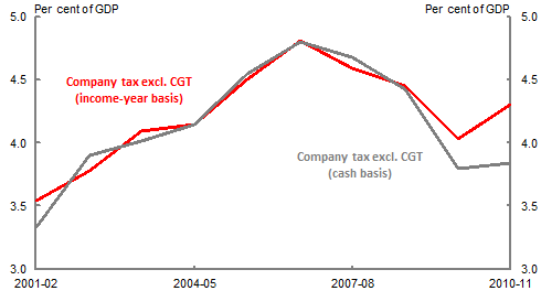 Trends in company tax can be better linked to the economy by abstracting from payment system effects and considering the tax on an income-year basis. This approach assigns the tax to the year in which the income was earned, rather than the 'cash' system where the tax is recorded in the year the liability was paid. The disadvantage of this approach is that income-year tax data comes with a significant lag and can be accurately determined only for 2010-11 and earlier.