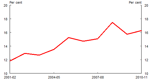 CGT receipts temporarily boosted the tax-to-GDP ratio from the early-2000s to 2007-08. Abstracting from CGT, the tax-to-GDP ratio fell steadily for six consecutive years between 2004-05 and 2010-11 (see figure 11). These falls were driven by both structural factors, as discussed above and below, and the onset of the GFC.