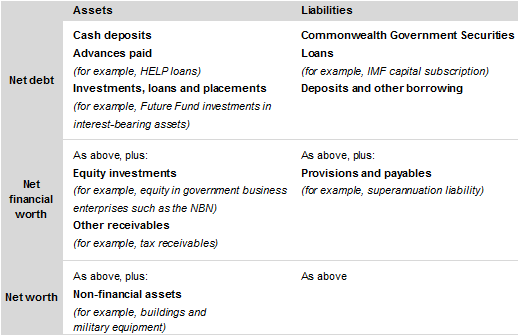 The government's balance sheet reports the stock of all government assets and liabilities. Measures such as Commonwealth Government Securities (CGS) on issue, net debt, net financial worth and net worth are aggregates that can be drawn from the balance sheet to provide an indication of the government's financial position at a point in time.2