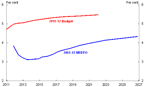 The yield curve is the comparison of the interest rates on government bonds of different maturity, which is determined by market conditions. Chart 3 shows the shift in the yield curve from the 2011-12 Budget to the 2011-12 MYEFO.