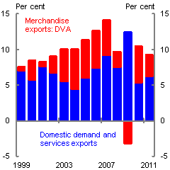 we estimate that from World Trade Organization (WTO) accession at the end of 2001 through to 2008, DVA in merchandise exports contributed approximately 25 per cent of China's total GDP growth — significantly higher than in the four years prior to accession. This fell to 23 per cent over the two year period from 2010 (Panel A).6 Further, merchandise export activities directly accounted for 17 per cent of GDP in 2011, down slightly from just prior to the Global Financial Crisis (Panel B). These results demonstrate that China remains linked to global economic developments via demand for its exports, although less so than the gross export figures may suggest.