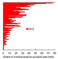 Chart 6 shows China's world export market shares across product categories from the Harmonized Commodity Description and Coding System (HS) of tariff nomenclature, ranked by China's share of global exports in each of these product markets as they stood in 2001. China's share of some low-end products (generally towards the top of the vertical axis), such as footwear, leather goods and other textiles, and toys, are arguably approaching a saturation point beyond which further advances in market share may not be feasible.