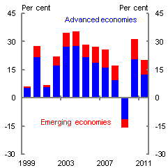 China's unparalleled rise as a merchandise exporter in recent decades also reflects a long period of relatively favourable conditions in the global economy prior to the global financial crisis (GFC). This supported growing demand for China's merchandise exports, particularly from advanced economies. Reflecting this external dependence, China's exports fell 16 per cent in 2009 as advanced economy demand contracted in the wake of the GFC, belying arguments that China had 'de-coupled' from the global economic cycle (for example, see Anderson, 2007).