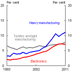 This mainly reflects a marginal fall in China's share of the textile and light manufacturing markets (in the US, EU, and Japan), from almost 56 per cent in 2010 to 54 per cent in 2011 (after jumping from 34 per cent in 2001). Textiles and light manufactured goods are more labour-intensive in production than goods higher up the value chain and efficiency gains may be harder to come by. Thus, these products are more sensitive to rising labour costs. While China still commands a dominant market share in this category, there is evidence that other emerging economies are beginning to gain a foothold. For example, between 2001 and 2011 Vietnam's share of these goods mar