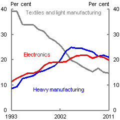 The combined effects of exchange rate appreciation and increases in wages and other production costs can be seen in movements in the real effective exchange rate (REER).14 Since mid-2005, China's REER (as measured by the Bank for International Settlements) has risen almost 30 per cent. This appreciation is substantially greater than in many of China's principal trade competitors in Asia. Over the same period, the REERs for Indonesia and Thailand have both risen by less than 20 per cent, and by only 1 per cent for Japan. India's REER has fallen 3 per cent, and the REERs for Korea and Taiwan have both fallen by more than 15 per cent.