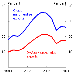 6 Estimates can vary. For example, using the preliminary results of Koopman et al (2012), Guo and N'Diaye (2009) estimated that DVA in exports contributed over 30 per cent of Chinese GDP growth between 2001 and 2008, up from 15 per cent in the 1990s.