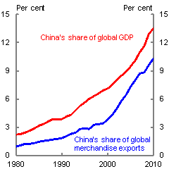 In the same way, China's move towards more sophisticated manufactured exports is likely to give rise to a new set of opportunities for firms in advanced economies. Countries such as Australia will be able to link into these emerging global supply chains, including through the provision of related technical and professional services. Indeed, China has already overtaken the US and Japan to become Australia's largest services export market, accounting for 11.3 per cent of total services exports in 2011 (although this is mostly accounted for by education and tourism).20