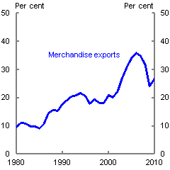 China's rise as a merchandise exporter in recent decades is unparalleled. Supported by a rapidly growing urban workforce, massive investments in productivity-enhancing infrastructure and technologies, a range of subsidies and incentives, and a favourable external economic environment, Chinese merchandise exports reached a staggering 36 per cent of China's GDP in 2006. However, this remarkable export performance, which is somewhat exaggerated by China's assembly role in global supply chains, is unlikely to continue, as Chinese exports reach saturation point in some export markets and domestic wages continue to rise. Instead, future export growth will increasingly be led by shifts in China's exports towards more sophisticated goods and services as China adopts more advanced manufacturing technologies, and towards emerging economy destinations. This will underpin continued rises in China's productivity and living standards, allowing consumer spending to become a more important internal driver of growth, as the economy reduces its reliance on export and investment demand.