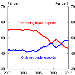 Rapid export growth has been largely driven by China's participation in vertically integrated global production supply chains — where different activities in the production of a single good are carried out in different economies.7 Chinese factories often form the final link — assembling and packaging the textile, light manufacturing, and electronic components that are primarily designed, produced, and marketed abroad. This is reflected in the high share of processing exports in total Chinese trade and is consistent with the outsourcing strategies of foreign firms that have shifted low-skilled, labour-intensive production processes to China (although as illustrated in Chart 3, Panel A, the value of ordinary exports has recently eclipsed that of processing exports).8