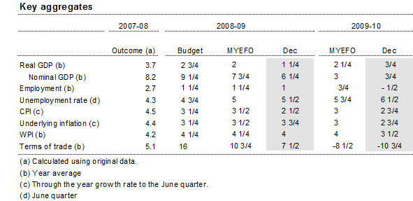 Real GDP growth in 2008-09 has been revised down from 2 per cent at MYEFO to 1¼ per cent. In 2009-10, real GDP growth has been revised down from 2¼ per cent to ¾ per cent. Through 2009, quarterly GDP is forecast to grow at 0.1 or 0.2 per cent. Given difficulties in forecasting specific quarters and the usual statistical error, any combination of these quarters could turn out to be negative.