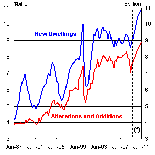 Strong population growth and a sluggish supply response in recent years appear to have led to substantial excess or pent-up demand. In the longer term, these factors are expected to support the housing sector. However, the prospect of higher interest rates is expected to slightly moderate growth in 2010-11. Dwelling investment is forecast to grow 11 per cent in 2010-11 compared to 12 per cent growth in MYEFO.