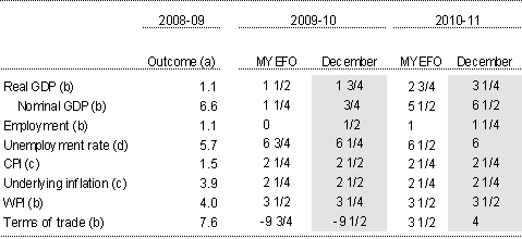 The Australian economy is expected to grow by 1¾ per cent in 2009-10, compared to 1½ per cent at MYEFO, while the growth forecast for 2010-11 is stronger at 3¼ per cent. As a result of the improved outlook and strong performance of the labour market, the unemployment rate is now expected to peak at 6¼ per cent in June 2010, half a percentage point lower than expected in MYEFO. The outlook for inflation has been revised up slightly from MYEFO.