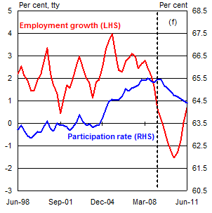 Although the participation rate is expected to decline, in the near term there is expected to be some support to participation from older workers remaining in the workforce in reaction to adverse wealth effects. As such, the participation rate is expected to remain at high levels at 65½ per cent in the June quarter 2009, before declining gradually over the next two years to 64¾ per cent in the June quarter 2010 and 64½ per cent by the June quarter 2011.
