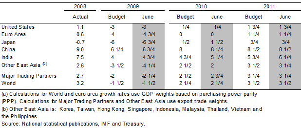 The outlook for a severe contraction in the world economy in 2009 remains unchanged since Budget. World GDP is forecast to contract by 1½ per cent in 2009, before a modest recovery to growth of 2¼ per cent takes hold in 2010.