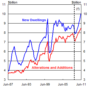 The Budget forecast of continuing strong growth in dwelling investment over 2010-11 remains unchanged, with forecast growth of 15 per cent in new dwellings, reflecting a strong underlying demand for new residential buildings and 8½ per cent growth in alterations and additions. The positive fundamentals are assumed to support house prices over the forecast horizon.