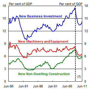 New business investment is expected to increase by 4 per cent in 2008-09. However, the weak global and domestic economic outlook is expected to lead to a significant deterioration in business investment over the forecast horizon, with a fall of 17 per cent expected in 2009-10 before a modest recovery of 3 per cent in 2010-11, marginally stronger than at Budget.