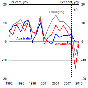 Export volumes are expected to be stronger than forecast at Budget, falling by 2½ per cent as global demand contracts. Modest growth of 4 per cent is expected in 2010-11, reflecting a recovery in the global economy.