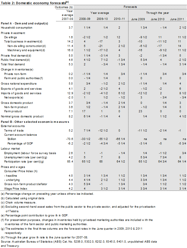 GDP growth forecasts for Australia have been revised up to growth of ¾ per cent in 2008-09 and a more moderate decline of ¼ per cent in 2009-10, up from a decline of ½ per cent at Budget. The outlook for 2010-11 remains unchanged, with the economy expected to begin a modest recover in that year, growing by 2¼ per cent.