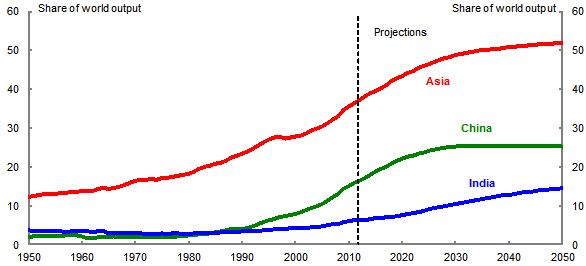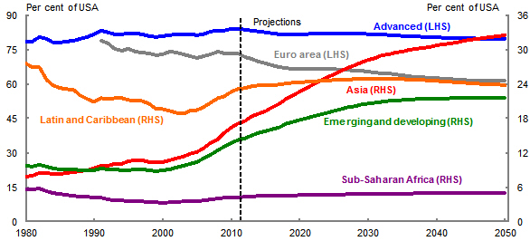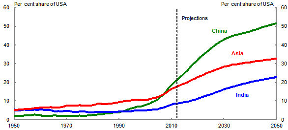 World output growth is expected to slow from an average annual rate of around 4 per cent between 2010 and 2020 to an annual average growth rate of around 2 per cent between 2040 and 2050. Again, this largely reflects developments in Asia, with average annual Asian GDP growth expected to fall from 6.3 per cent to 2.3 per cent over the same time period.