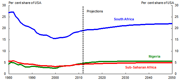Sub-Saharan Africa’s combined GDP is expected to grow at an annual rate of above 3 per cent over the projection period. Given the modest improvement expected in the region’s relative productivity, this in large part reflects strong population growth, with the region’s population expected to double over the next 40 years (see Table 5).