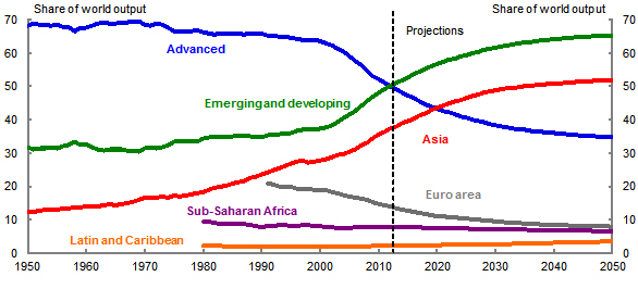 Our analysis suggests that the economy of the emerging and developing region is currently larger than the economy of the advanced region (see Chart 8). This reflects the rapidly shifting weight of global economic activity to fast-growing economies of Asia. We project that Asia will become the world’s largest economic region by 2020. Underlying this is the expectation that the combined economies of China and India will become larger than the advanced economies by the middle of the 2030s. Chart 8 reveals that the rising global share of Asia will be offset by declining shares for both the advanced and Latin America and Caribbean regional economies.