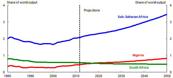 The sub-Saharan African region’s share of world output is currently around 2 per cent. We expect this share rise to 3.5 per cent by 2050 (see Chart 10). Nigeria and South Africa are expected to be the major single economies of the Sub-Saharan Africa region over this period, with Nigeria’s importance rising steadily in the region from 0.5 per cent of world GDP today to just under 1 per cent by 2050.